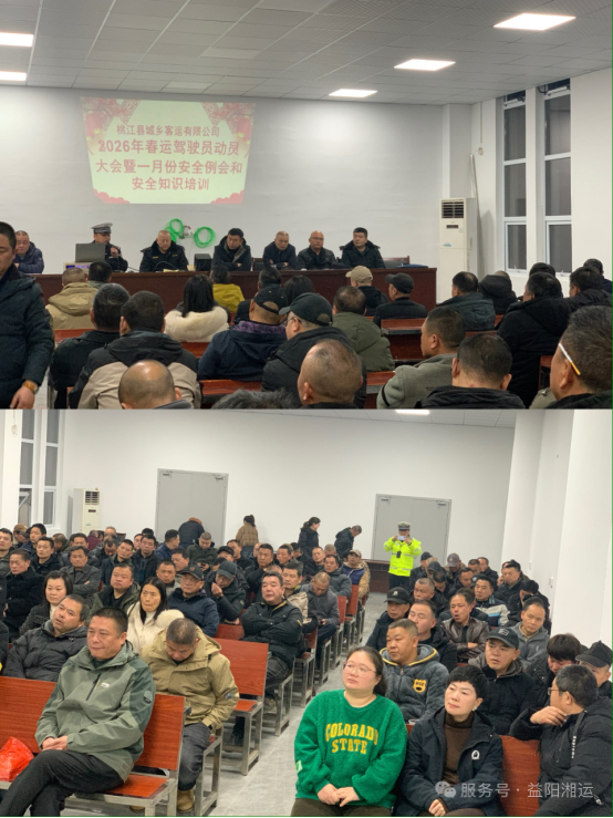 1月28日晚上7:30,桃江城鄉(xiāng)客運(yùn)有限公司召開(kāi)了桃江片區(qū)2026年春運(yùn)駕駛員安全生產(chǎn)動(dòng)員大會(huì)及安全教育培訓(xùn)會(huì)??h交警大隊(duì)一中隊(duì)中隊(duì)長(zhǎng)肖建平、縣道運(yùn)中心副主任鄒凱參加。